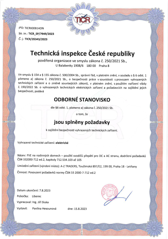 | Umístění | Venkovní - montáž na nosný systém PV panelů |