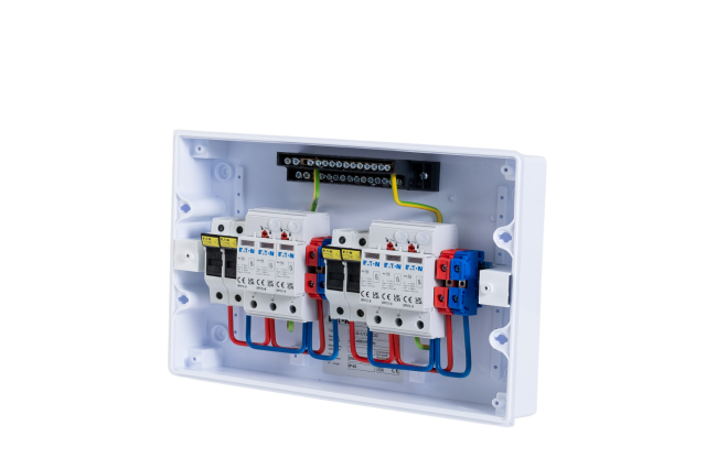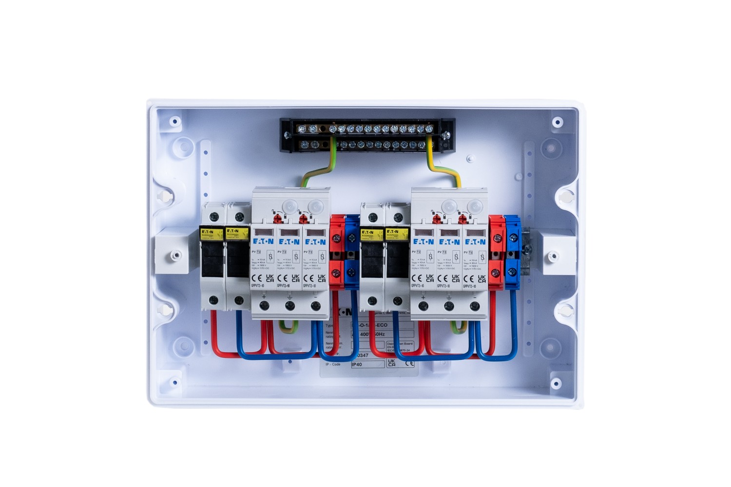 Rozdzielnica prądu stałego przeznaczona do montażu naściennego o stopniu ochrony IP40/20 służąca jako rozdzielnica wejściowa z paneli fotowoltaicznych (do falownika) dla całej oferty elektrowni fotowoltaicznych. Zwłaszcza przy zastosowaniu innych rozdzielnic, także EATON BC-O-1/12-ECO. Jej zaletą są niewielkie rozmiary, możliwość „sztaplowania” z innymi rozdzielnicami AC obok siebie lub pod sobą, co sprawia, że można ją zamontować nawet w przestrzeni, w której problemem jest miejsce. Rozdzielnica wyposażona jest w ogranicznik przepięć prądu stałego oraz rozłączniki bezpiecznikowe, w tym bezpieczniki gPV, zabezpieczające wejście prądu stałego do falownika. Nadaje się do łączenia z rozdzielnicami części AC instalacji zamontowanej w rozdzielnicach EATON BC-O-1/12-ECO.