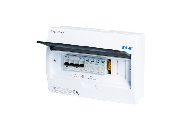 Nadaje się do połączenia z rozdzielnicą R-FVE-DC1T1, R-FVE-DC2T1 dla części DC instalacji i rozdzielnicą R-FVE-M5+P3F dla obwodów rezerwowych z przełącznikiem ręcznym (z obejściem falownika) i zabezpieczeniem lub rozdzielnicą R- FVE-Z3 z zabezpieczeniem prądowym, gniazdami i bezpiecznikiem.