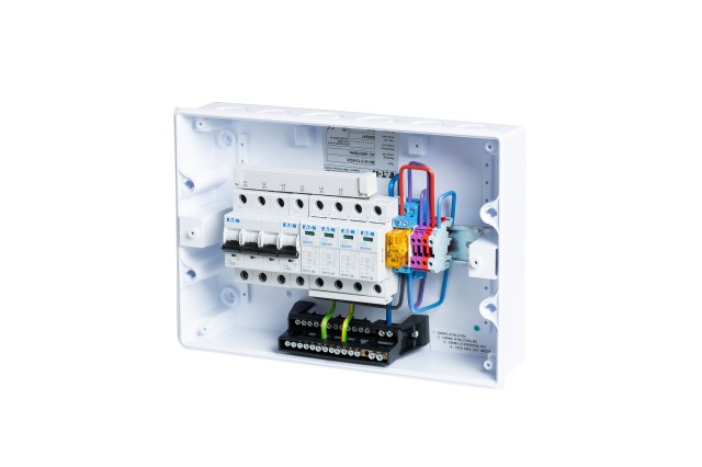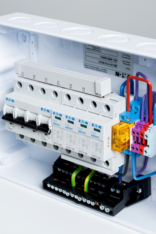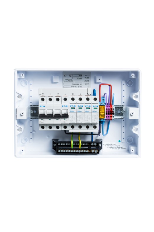Rozdzielnica wyposażona jest w ogranicznik przepięć prądu przemiennego T1+T2, wyłącznik nadprądowy B20/3 chroniący wejście do falownika. Ponadto wyłącznik B2/1, który zabezpiecza wyszukiwarkę GNIAZD/PRZEKAŹNIKÓW, co zapewnia spełnienie warunków dystrybucji N0% (obejmuje styki NC i NO oraz środek). Zapewnia zastosowanie we wszystkich typach przetwornic dostępnych na rynku.
