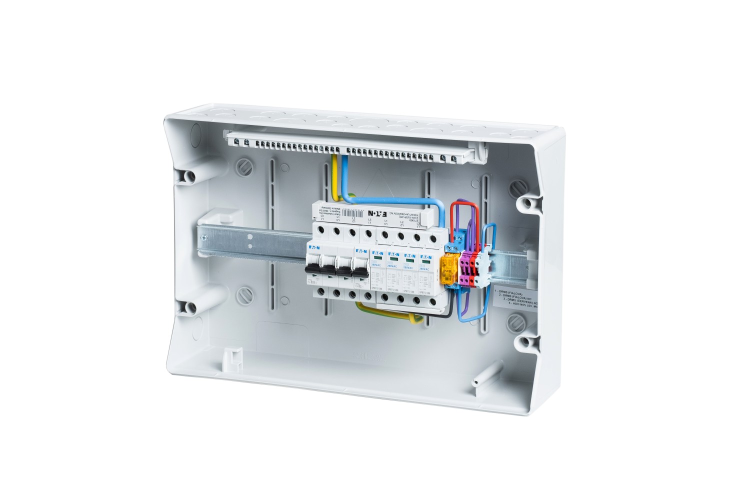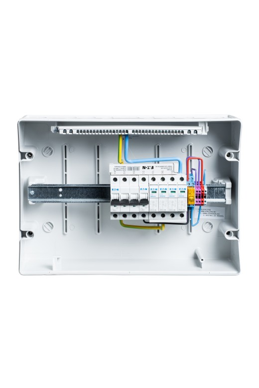 Rozdzielnica wyposażona jest w ogranicznik przepięć prądu przemiennego T1+T2, wyłącznik nadprądowy B25/3 chroniący wejście do falownika. Ponadto wyłącznik B2/1, który zabezpiecza wyszukiwarkę GNIAZD/PRZEKAŹNIKÓW, co zapewnia spełnienie warunków dystrybucji N0% (obejmuje styki NC i NO oraz środek). Zapewnia zastosowanie we wszystkich typach przetwornic dostępnych na rynku.