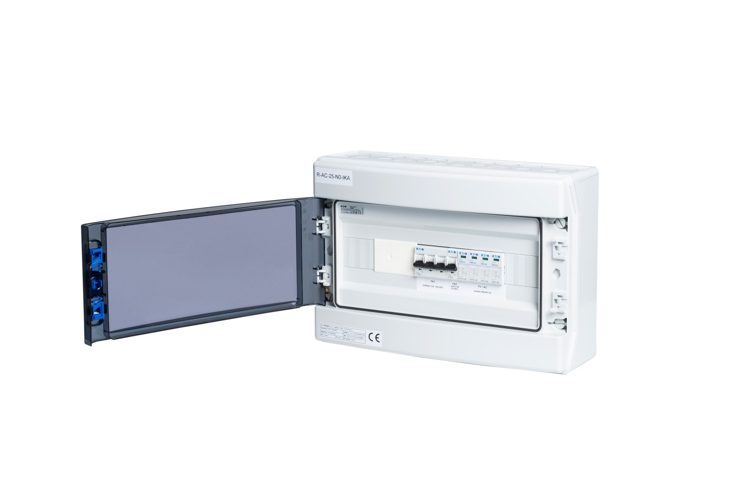 Nadaje się do łączenia z rozdzielnicą R-FVE-DC2T1-IKA, R-FVE-DC3T1-IKA dla części instalacji prądu stałego oraz rozdzielnicą R-FVE-A40-2 dla obwodów rezerwowych z wyłącznikiem ręcznym (z obejściem falownika), lub rozdzielnica R-FVE-Z4 z wyłącznikiem, gniazdami i bezpiecznikiem.
