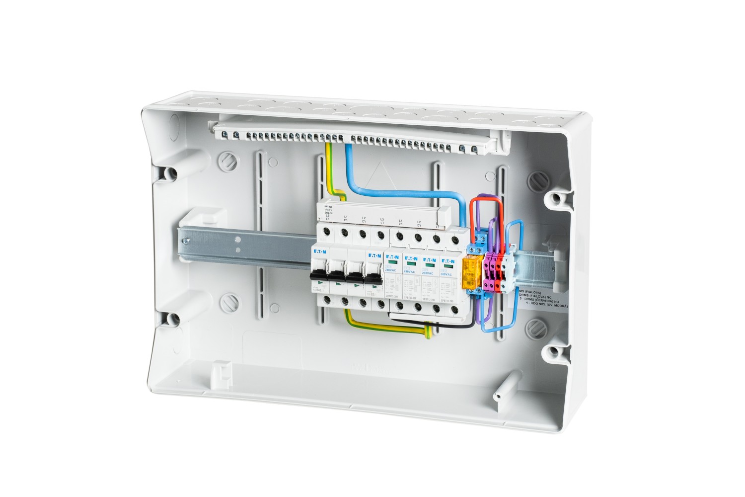 Nadaje się do łączenia z rozdzielnicą R-FVE-DC2T1-IKA, R-FVE-DC3T1-IKA lub do R-FVE-DC9T1-IKA dla części DC instalacji i rozdzielnicą R-FVE-A40-2 dla obwodów rezerwowych z przełącznik ręczny (z obejściem falownika), lub rozdzielnica R-FVE-Z4 z wyłącznikiem, gniazdami i bezpiecznikiem.