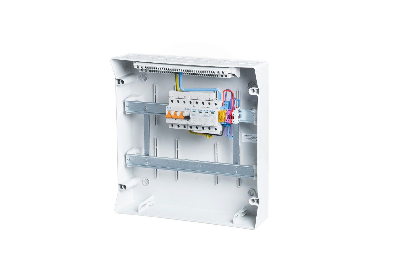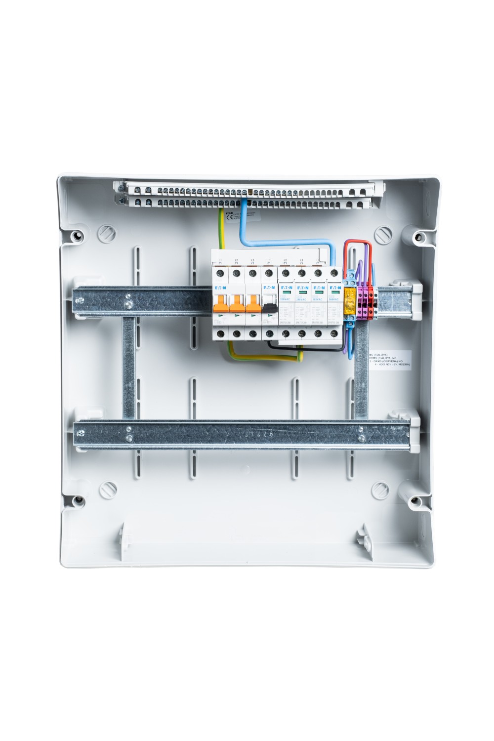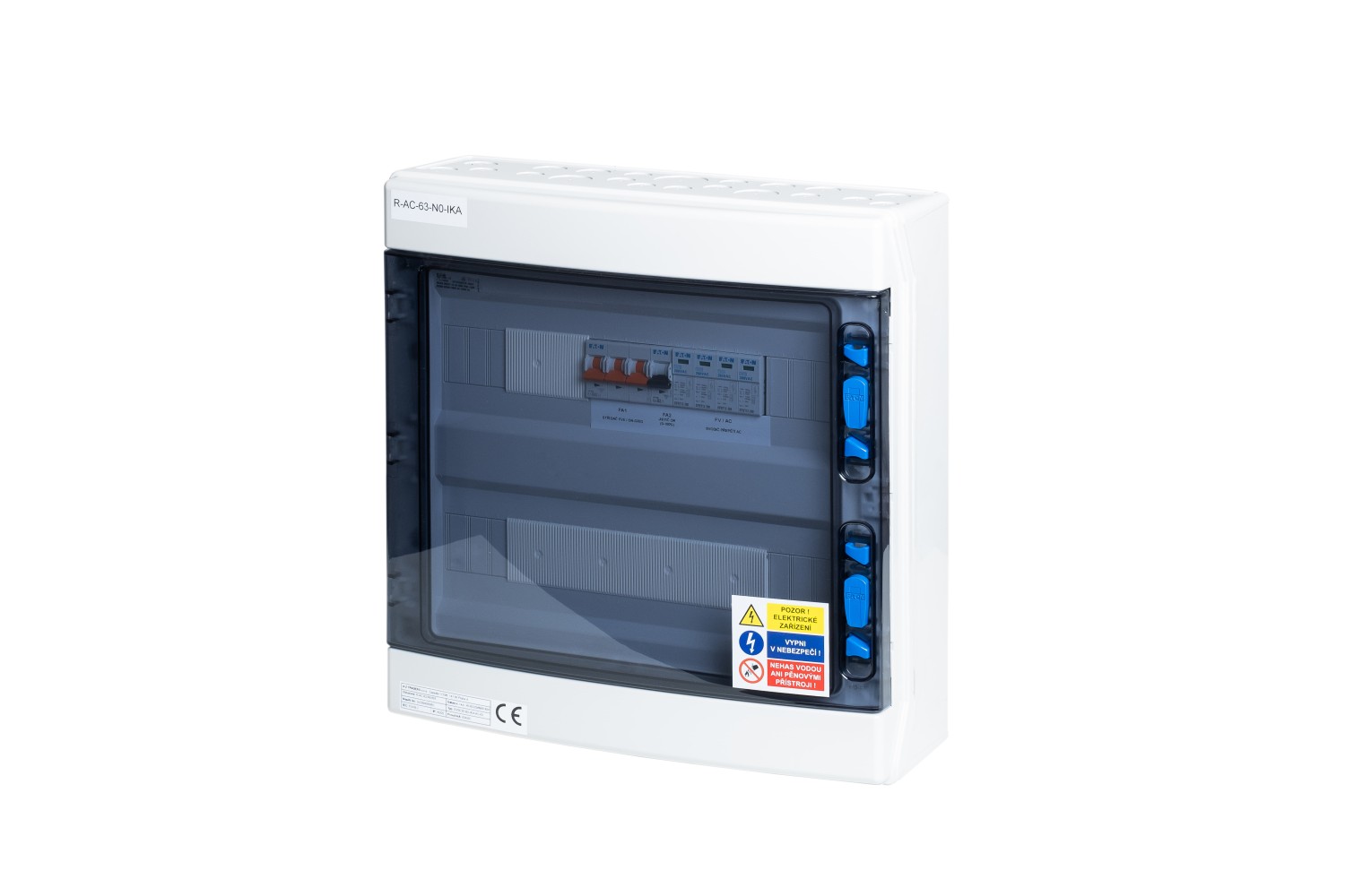 Rozdzielnica wyposażona jest w ogranicznik przepięć prądu przemiennego T1+T2 oraz wyłącznik B63/3 chroniący wejście do falownika. Ponadto wyłącznik automatyczny B2/1, który zabezpiecza wyszukiwarkę gniazd/przekaźników, co zapewnia spełnienie warunków dystrybucji N0% (obejmuje styki NC i NO oraz środek). Co zapewnia zastosowanie we wszystkich typach przetwornic dostępnych na rynku.