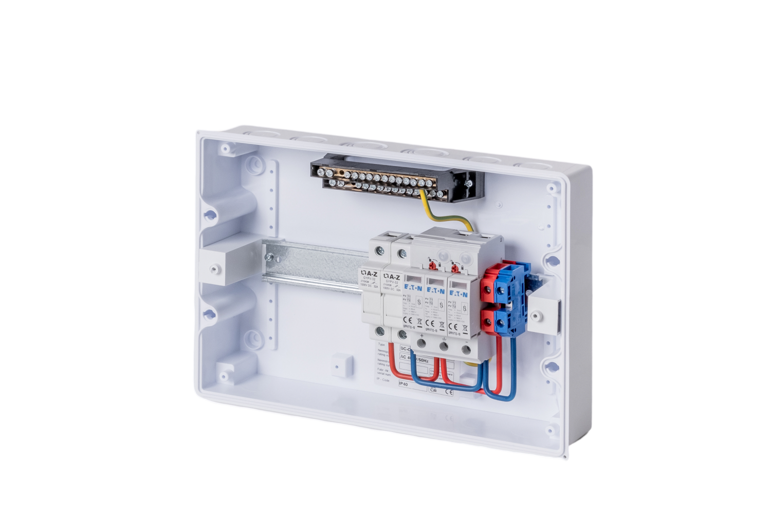 Rozdzielnica prądu stałego przeznaczona do montażu naściennego o stopniu ochrony IP40/20 służąca jako rozdzielnica wejściowa z paneli fotowoltaicznych (do falownika) dla całej oferty elektrowni fotowoltaicznych. Zwłaszcza przy zastosowaniu innych rozdzielnic, także EATON BC-O-1/12-ECO.