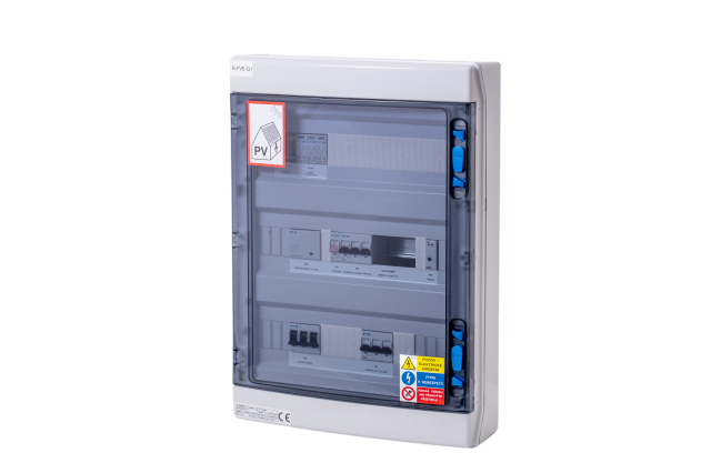 Rozdzielacz AC+DC. Przeznaczony do montażu na ścianie. Stopień ochrony IP65. Rozdzielnica służy do obsługi trójfazowej elektrowni fotowoltaicznej (zazwyczaj falownik GROWATT lub inne falowniki z pomiarem bezpośrednim). Niewątpliwą zaletą jest minimalna ingerencja w rozdzielnicę klienta – pomiar falownika znajduje się właśnie tutaj, wspólny punkt przebicia i wszystkie bezpieczniki wchodzą w skład tej rozdzielnicy. Wystarczy zrobić pętlę pomiędzy hl. rozmieszczenie rozdzielnic i technologii. Rozdzielnica wyposażona jest także w wyłącznik awaryjny falownika HDO (N0%). Rozdzielnica R-FVE-G1 przeznaczona jest dla wyłącznika głównego w kolumnie o maksymalnym natężeniu 40A. Obejmuje również rozłączniki bezpiecznikowe prądu stałego i ograniczniki przepięć. W rozdzielnicy nie ma ogranicznika przepięć prądu przemiennego