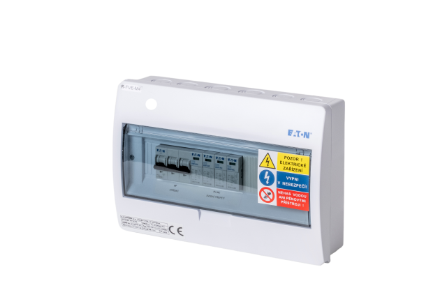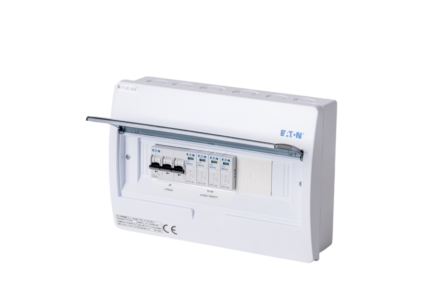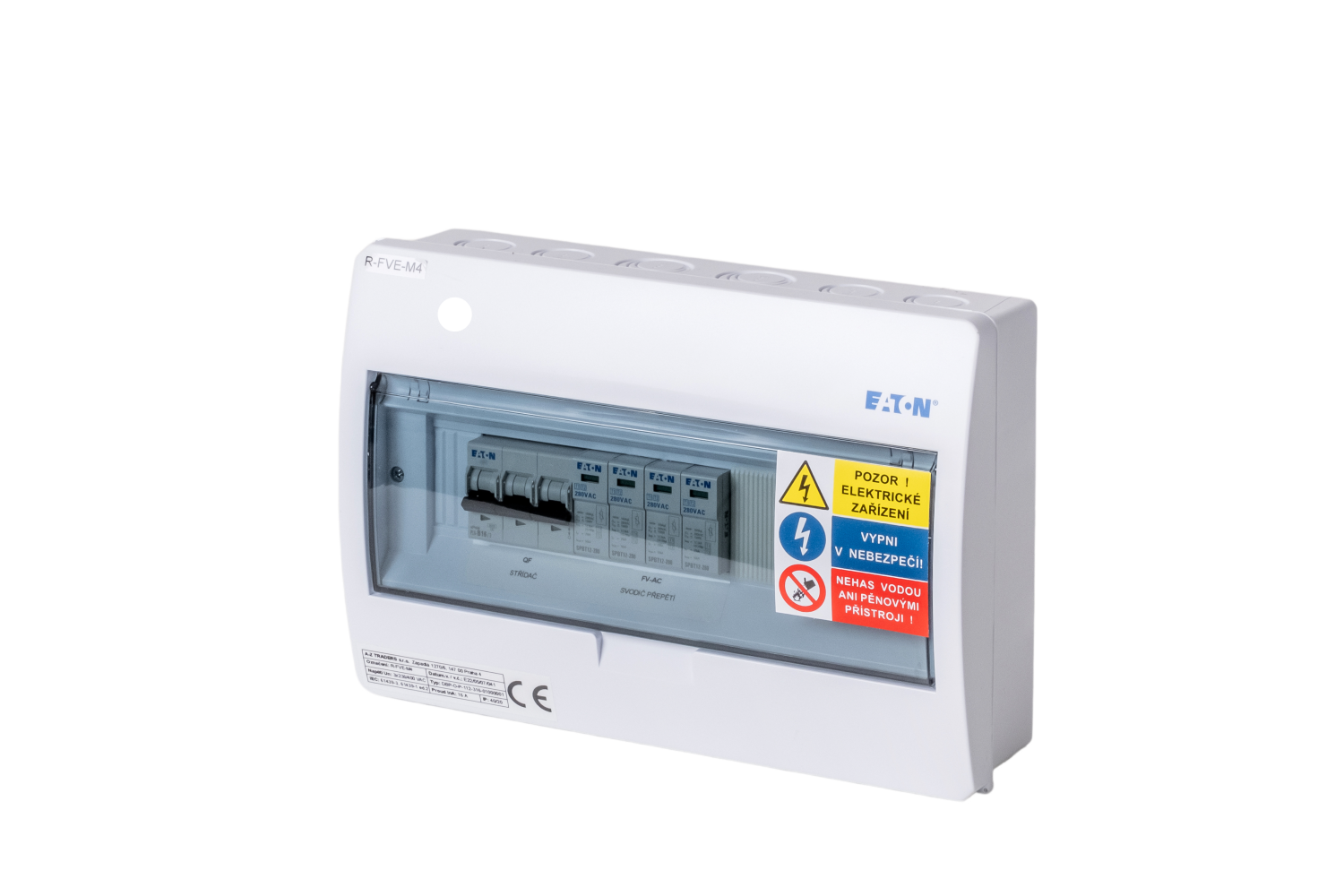 Nadaje się do połączenia z rozdzielnicą R-FVE-DC1, R-FVE-DC2 dla części DC instalacji i rozdzielnicą R-FVE-M5+P3F dla obwodów rezerwowych z przełącznikiem ręcznym (z obejściem falownika) i zabezpieczeniem lub rozdzielnicą R- FVE-Z3 z zabezpieczeniem prądowym, gniazdami i bezpiecznikiem.