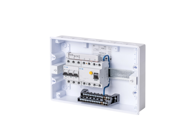 Rozdzielnica prądu przemiennego przeznaczona do montażu naściennego o stopniu ochrony IP40/20 służąca jako rozdzielnica wyjściowa (przy falowniku) dla trójfazowych elektrowni fotowoltaicznych (zwykle falownik 4 do 10K-ET) w celu zapewnienia ochrony wyjścia łącznie z zabezpieczeniem prądowym.